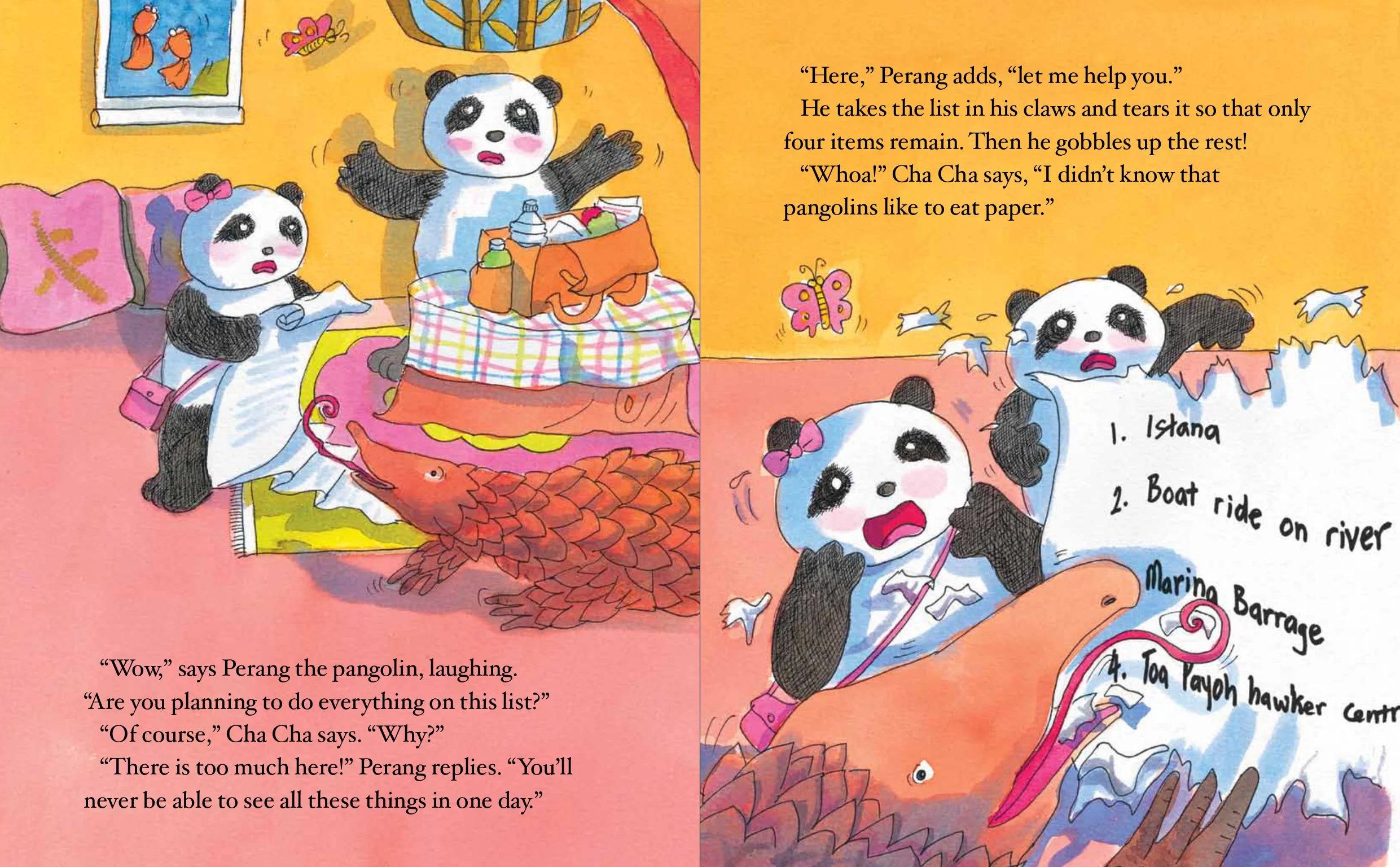 Bo Bo and Cha Cha have settled comfortably into their new home at the Mandai Zoo, and are ready to explore Singapore. Having heard so much about what this country has to offer, they come up with a long list of places to visit. However, Perang the pangolin advises them that it would take too long to see everything, so they end up visiting the Istana, taking a bumboat ride on the Singapore river, flying kites at the Marina Barrage, eating at a hawker centre in Toa Payoh, and even playing on swings!