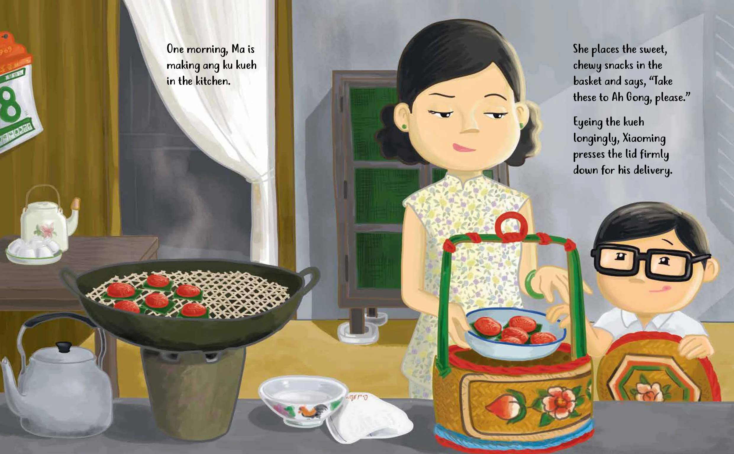Get the E-book Listen to the audiobookIn this sequel to The Amazing Sarong, a beautiful Chinese wedding basket is used in myriad ways. Xiaoming delivers a batch of ang ku kueh with the basket, then fashions it into a prop for a lion dance. When the sun beats down on him, he repurposes the basket's cover as a hat! At home in a second-floor shophouse, the basket is attached to a rope to pass a comic book and a bowl of noodles. Oh, how creative of Xiaoming!